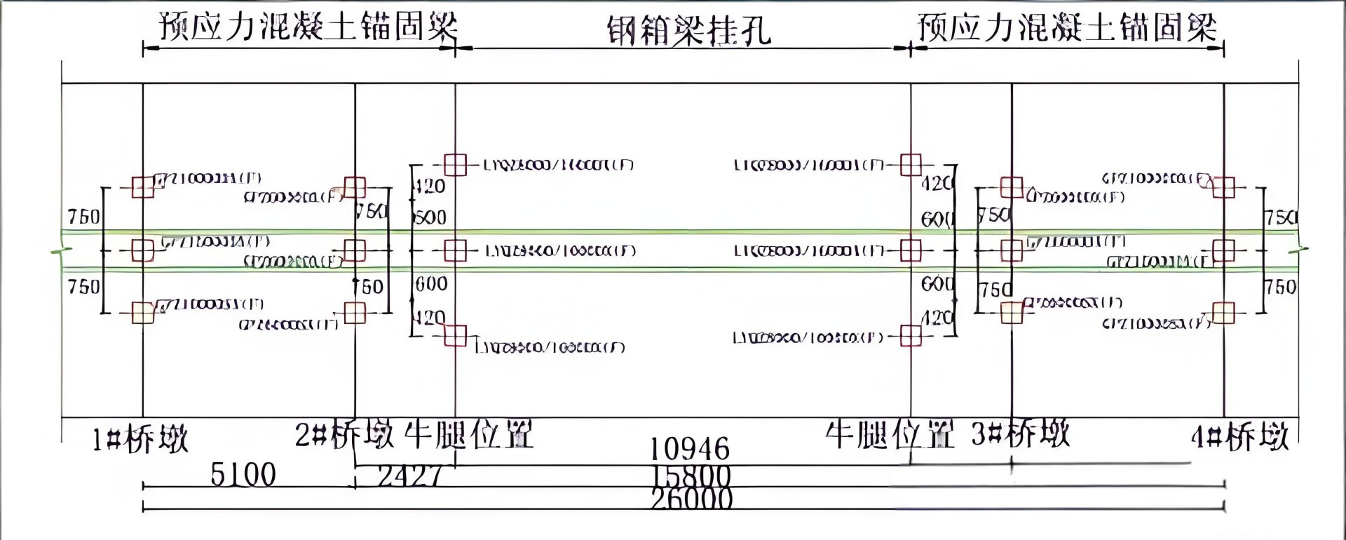 According to the design drawings of the bridge, there are three spherical longitudinal supports on one side of the cow leg position, totaling six for the entire bridge. The support models are all LYQZ8000/1600DX (F). In this experiment, a displacement meter will be installed at the bottom of the steel box beam and concrete beam directly below the bracket at the cow leg position. The displacement difference between the two will be measured to determine whether there is a detachment phenomenon in the bracket (see Figure 1 and Figure 2). The principle of testing is: if the support is intact, the displacement difference at the same position should be zero or close to zero; If there is a void phenomenon in the support, due to the fact that the vehicle load is mainly applied above the steel hanging hole during the test loading, the downward displacement of the steel box beam under the load will be much greater than that of the concrete beam, and there is a significant displacement difference between the two.