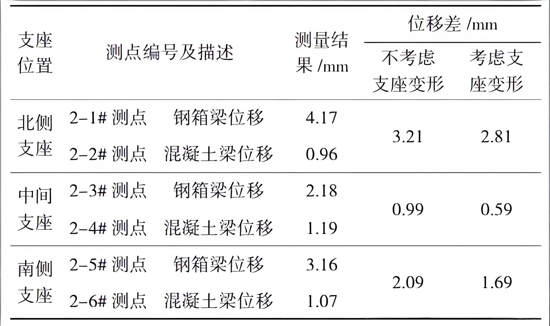 The experiment used 6 three axle load trucks each weighing 350kN (a total of 2100kN) to conduct static pressure on the bearings, while considering the correction of the deformation of the spherical bearings under load. The specific experimental results are shown in Tables 1 and 2.