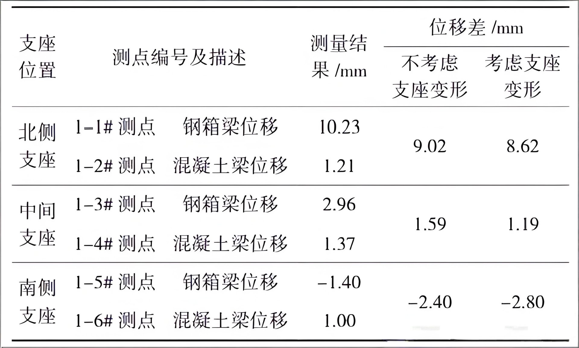 According to Tables 1 and 2, considering the deformation of the supports, the displacement differences between the supports at the west end of the cow leg position from north to south are 8.62mm, 1.19mm, and -2.80mm, respectively. The displacement differences between the supports at the east end of the cow leg position from north to south are 2.81mm, 0.59mm, and 1.69mm, respectively. Except for the negative displacement difference of the support seat on the south side of the west end, the displacement differences of the other supports are all greater than 0, with a maximum value of 8.62mm, indicating that the above support positions are all in a state of detachment.