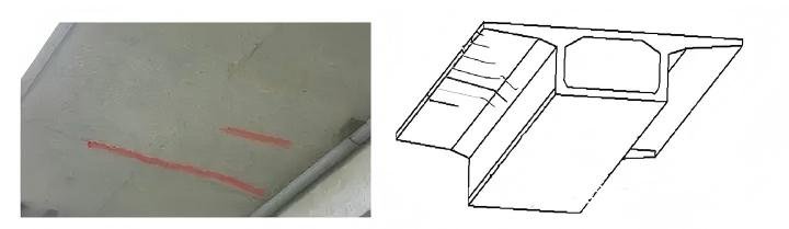 The oblique cracking of the beam end and the longitudinal cracking of the wing plate may be defective in the design or caused by excessive shear force on the web during later maintenance and improper management of overrun vehicles. The shear resistance of the beam end near the support is insufficient, and finally the beam end is cracked diagonally.