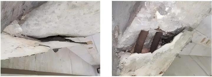 Some T-beams have concrete fracturing and spalling caused by the death of the beam end, which may be due to the length exceeding the design length or installation misalignment during the prefabrication of the beam.