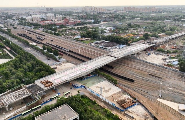 The Qiqihar Civil Aviation Road Overpass Bridge Project has a total length of 897.2m. The main bridge deck is arranged as a whole, using single box four chamber variable cross-section prestressed concrete box girders with a span arrangement of (95+162+95) m continuous box girders. The bridge has a total width of 34.4m and is constructed using large section cast-in-place and swivel method. The swivel structure weighs about 27500 tons per unit and spans 21 existing railway lines. Among them, Pier 7 rotates clockwise by 84.69 ° and Pier 8 rotates counterclockwise by 95.61 °, with a rotation accuracy of millimeter level.