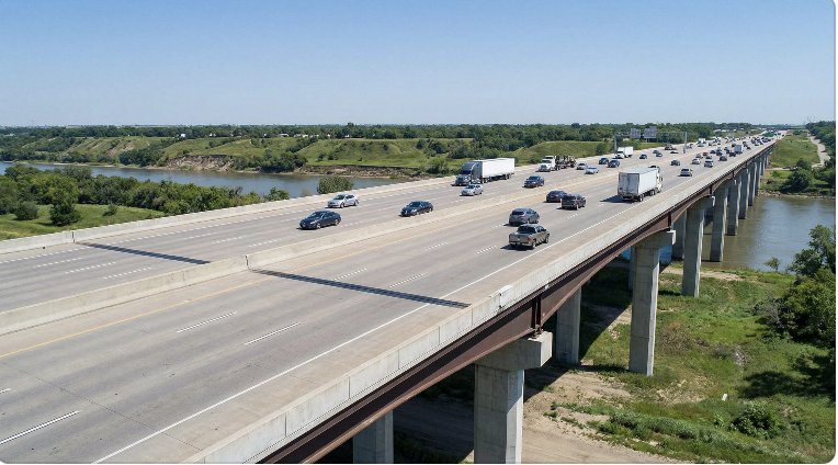 Multiple expansion joints visible in the deck of a major highway bridge. On long-span bridges, expansion joints are required at regular intervals to accommodate the cumulative thermal movements of the bridge deck. Their correct selection, installation, and maintenance is critical to the long-term performance of the bridge.