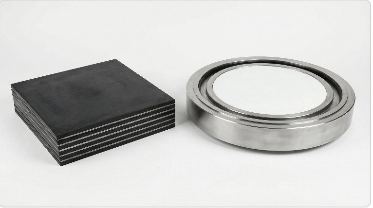 Left: Laminated elastomeric bearing pad (natural rubber with steel shim plates). Right: Circular pot bearing with PTFE sliding disc. Both are standard bridge bearing types supplied by Bridgent.