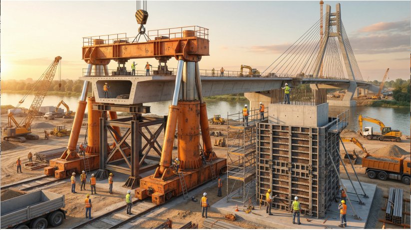 A modern bridge construction site brings together a complex ecosystem of heavy equipment and specialty materials. Hydraulic jacks, custom steel formwork, and precision-engineered specialty products all play critical roles in delivering a safe, durable, and cost-effective structure.