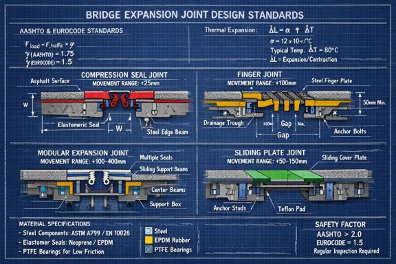 Both standards require that expansion joints be designed to accommodate all anticipated movements without imposing excessive stresses on the joint system or adjacent bridge structures. The design must ensure that the joint functions properly throughout its entire service life, typically 30-50 years, with minimal maintenance requirements.![]()