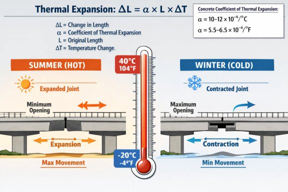 The most significant movement factor is caused by temperature variations. Concrete and steel expand when heated and contract when cooled. The thermal expansion is calculated using the formula: ΔL = α × L × ΔT