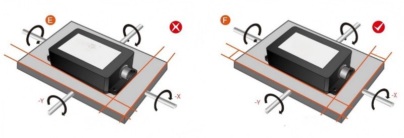 Secondly,the bottom line of the sensor and the axis of the measured object cannot have an angle as shown in Figure E, and the bottom line of the sensor should be kept parallel or orthogonal to the axis of rotation of the measured object during installation. This product can be installed horizontally or vertically (vertical installation needs to be customized), and the correct installation method is shown in Figure F