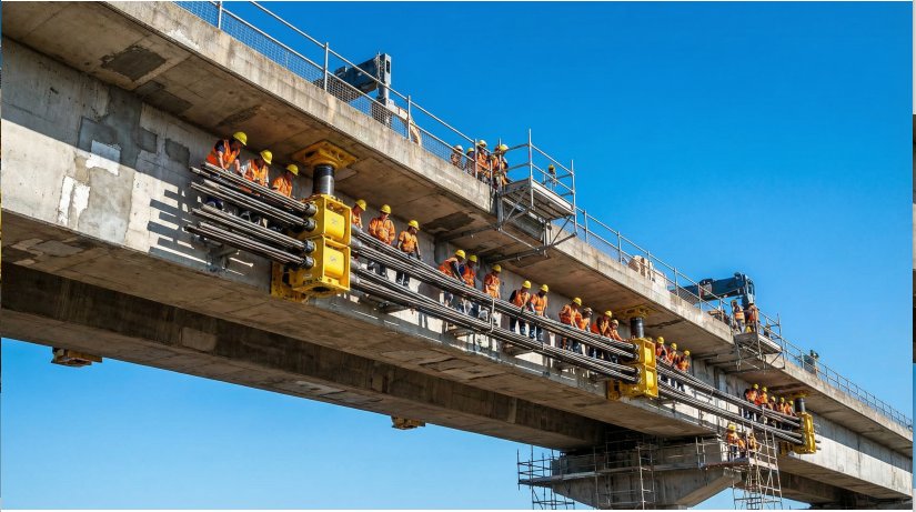 External post-tensioning is one of the most powerful tools available for increasing the load-carrying capacity of existing concrete bridges, particularly box girders and T-beams. High-strength steel tendons are threaded through the interior of the box girder or along the outside of the web, anchored at the ends of the span, and stressed using hydraulic jacks. The resulting compressive force counteracts the tensile stresses caused by traffic loading, effectively increasing the bridge's flexural capacity.