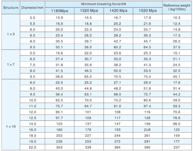 Notes: 1. The minimum breaking load of the cable is not less than 90% of the nominal breaking load of the cable body.