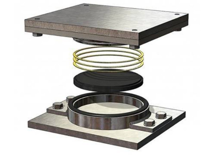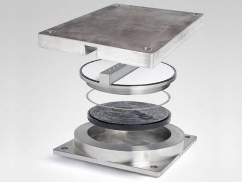 It incorporates a low-friction PTFE plate above the piston to enable smooth, multi-directional sliding.