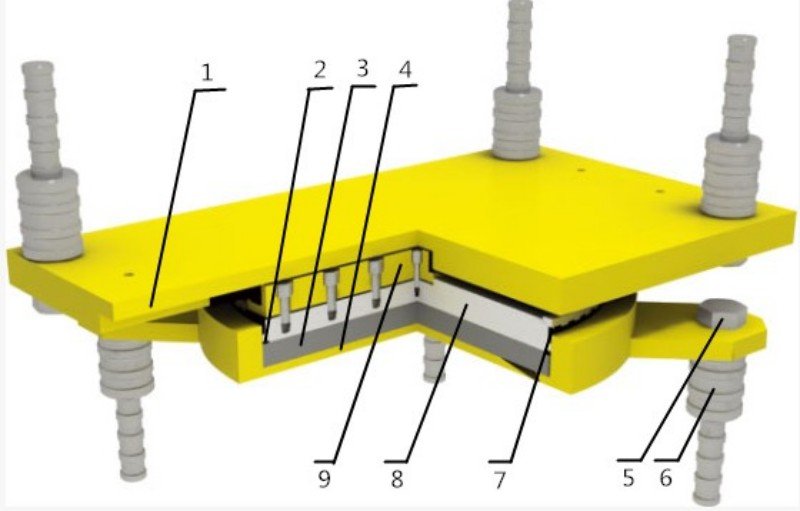 1-top plate; 2-brass seal; 3-elastomer disc; 4-pot; 5-anchor bolt; 6-sleeve; 7-rubber seal; 8-piston; 9-sliding guided part