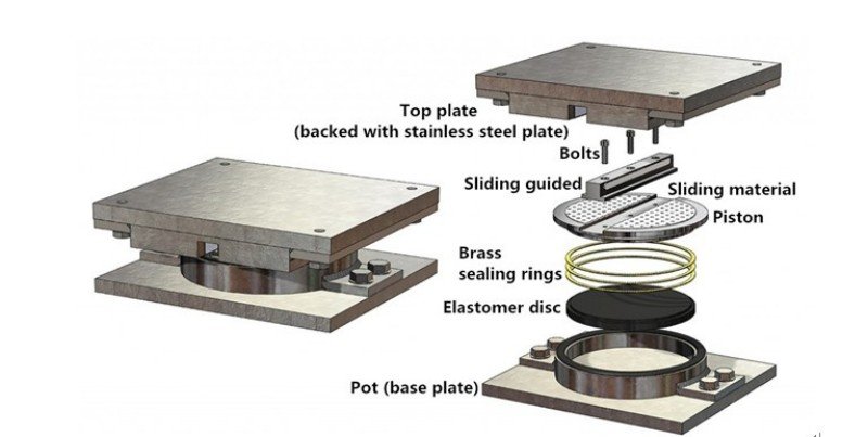 The pot bearing features an elastomeric pad confined within its steel pot. Under compressive load, this pad exhibits fluid-like behavior in a triaxial state of stress, enabling the bearing to accommodate large rotations. Horizontal displacements are achieved through the relative sliding motion between a PTFE plate mounted on the piston and a matching stainless steel surface.