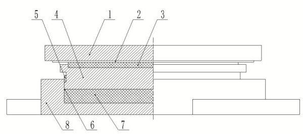 1. top plate; 2-brass seal; 3-elastomer disc; 4-pot; 5-anchor bolt; 6-sleeve; 7-rubber seal; 8-piston